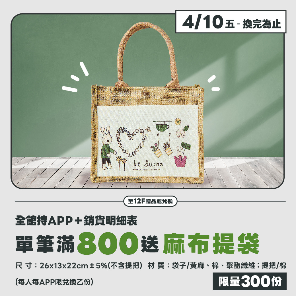 • 持APP於全館單筆滿800送麻布提袋