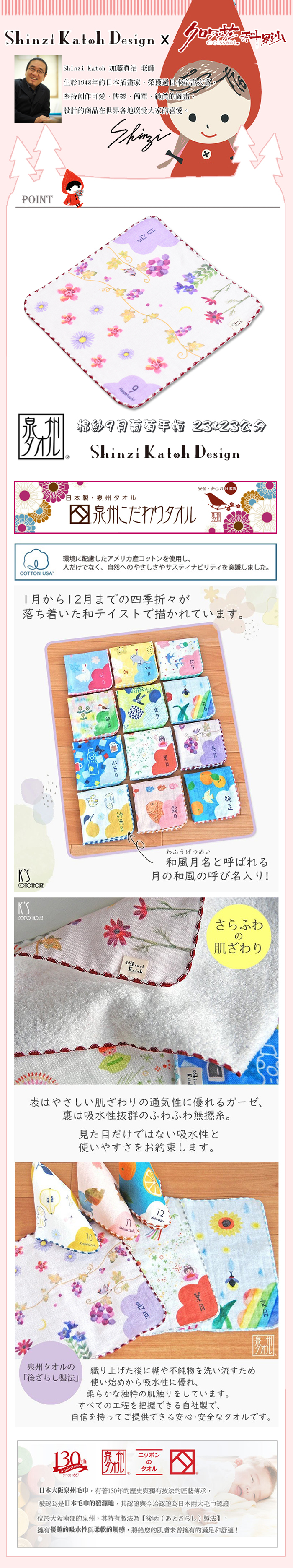 ●日本知名插畫家加藤真治的12個日本月名設計。 ●雙面紗布設計,輕柔舒適 ● 高吸水 × 快乾機能,媽媽育兒好幫手。 ●日本大阪泉州製造,130年歷史職人工藝。 ●匠心手作 × 安心滿分,舒適使用感與安全品質。