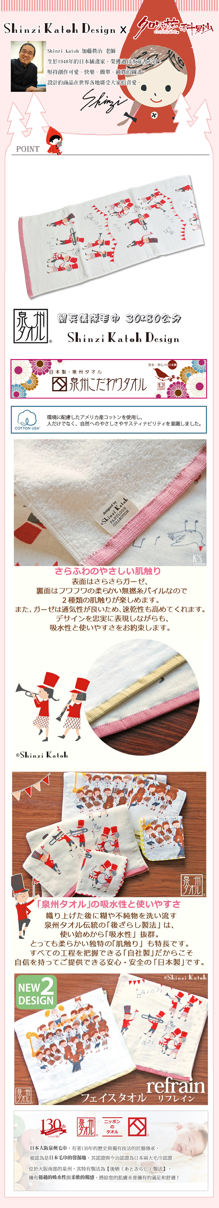●日本知名插畫家加藤真治的可愛插圖設計。 ●雙面紗布設計,輕柔舒適 ● 高吸水 × 快乾機能,媽媽育兒好幫手。 ●日本大阪泉州製造,130年歷史職人工藝。 ●匠心手作 × 安心滿分,舒適使用感與安全品質。