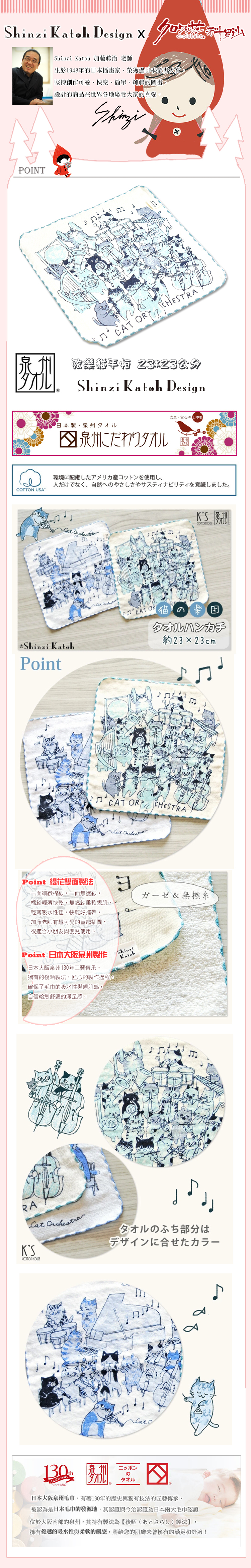 【加藤真治】無撚管弦貓手帕 23 x 23公分