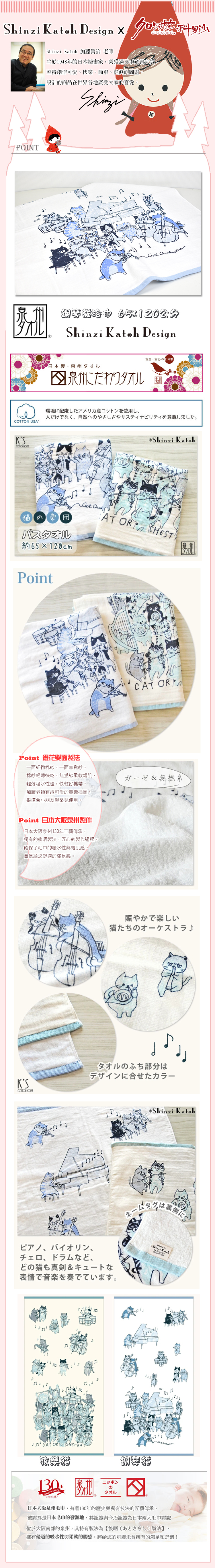 ●日本知名插畫家加藤真治的可愛插圖設計。 ●雙面紗布設計,輕柔舒適 ● 高吸水 × 快乾機能,媽媽育兒好幫手。 ●日本大阪泉州製造,130年歷史職人工藝。 ●匠心手作 × 安心滿分,舒適使用感與安全品質。
