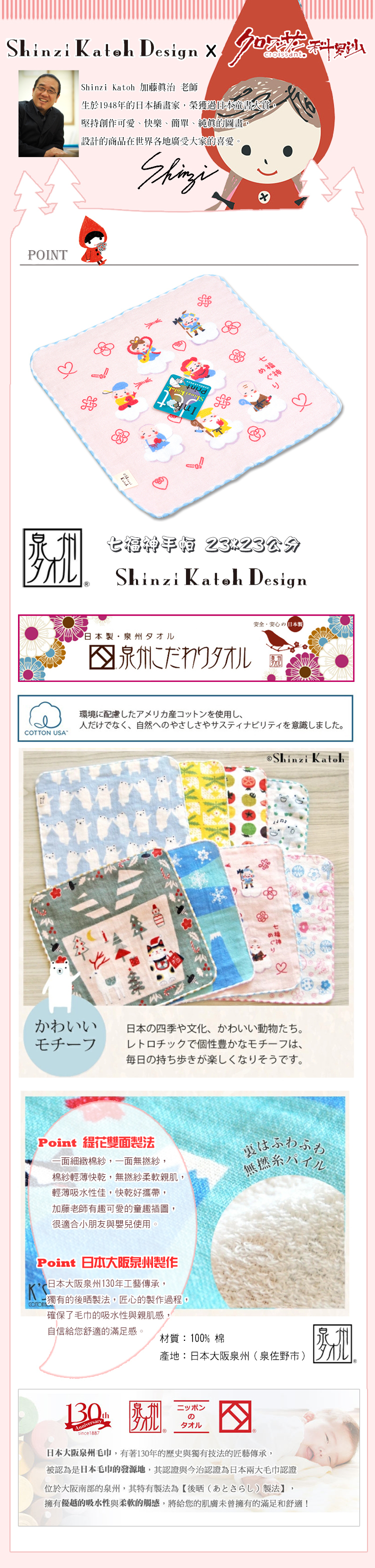 ●日本知名插畫家加藤真治的可愛插圖設計。 ●雙面紗布設計,一面棉紗,一面剪絨。 ● 高吸水 × 快乾機能,媽媽育兒好幫手。 ●日本大阪泉州製造,130年歷史職人工藝。 ●匠心手作 × 安心滿分,舒適使用感與安全品質。