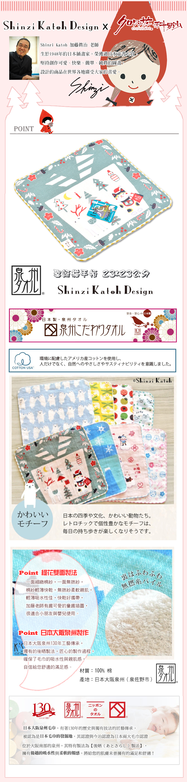 ●日本知名插畫家加藤真治的可愛插圖設計。 ●雙面紗布設計,一面棉紗,一面剪絨。 ● 高吸水 × 快乾機能,媽媽育兒好幫手。 ●日本大阪泉州製造,130年歷史職人工藝。 ●匠心手作 × 安心滿分,舒適使用感與安全品質。