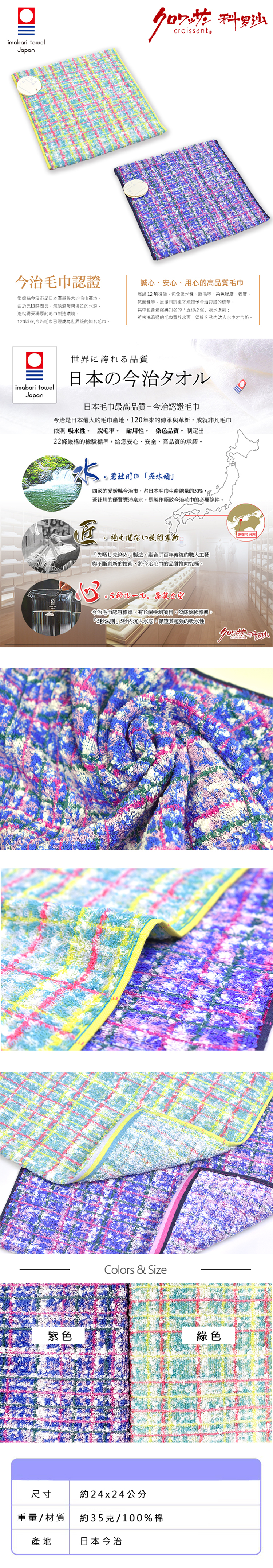 ●日本製造,通過「今治認證」,品質與吸水力俱佳。 ●採用無撚紗製成,觸感柔軟蓬鬆,親膚性極佳。 ●繽紛格紋織紋,充滿優雅與細膩的日系風格。 ●共有二種色系可選,滿足不同喜好與搭配需求。 ●雙面織造工藝,正反皆具美感與立體層次。