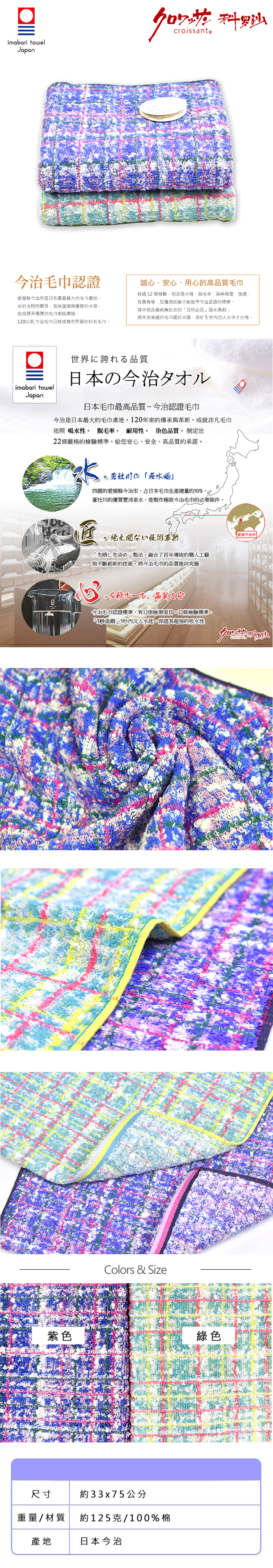 ●日本製造,通過「今治認證」,品質與吸水力俱佳。 ●採用無撚紗製成,觸感柔軟蓬鬆,親膚性極佳。 ●繽紛格紋織紋設計,充滿優雅與細膩的日系風格。 ●共有二種色系可選,滿足不同喜好與搭配需求。 ●雙面織造工藝,正反皆具美感與立體層次。