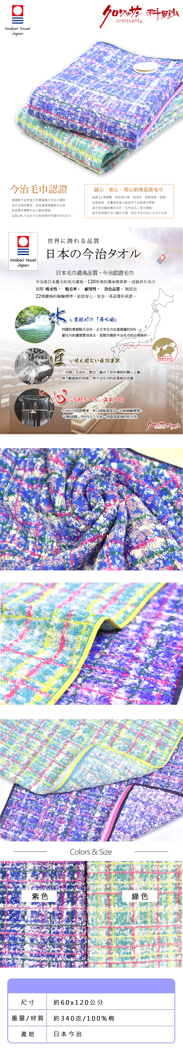 ●日本製造,通過「今治認證」,品質與吸水力俱佳。 ●採用無撚紗製成,觸感柔軟蓬鬆,親膚性極佳。 ●繽紛格紋織紋設計,充滿優雅與細膩的日系風格。 ●共有二種色系可選,滿足不同喜好與搭配需求。 ●雙面織造工藝,正反皆具美感與立體層次。