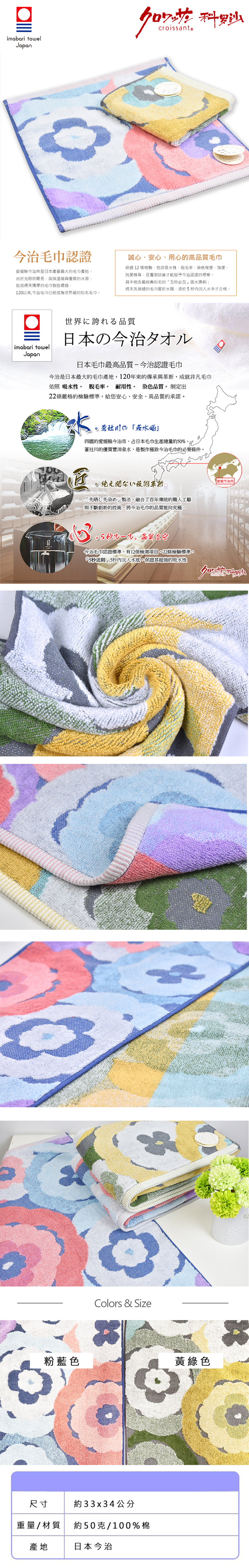 ●日本製造,通過「今治認證」,品質與吸水力俱佳。 ●採用無撚紗製成,觸感柔軟蓬鬆,親膚性極佳。 ●繽紛花朵交疊設計,充滿優雅與細膩的日系風格。 ●共有二種色系可選,滿足不同喜好與搭配需求。 ●雙面織造工藝,正反皆具美感與立體層次。
