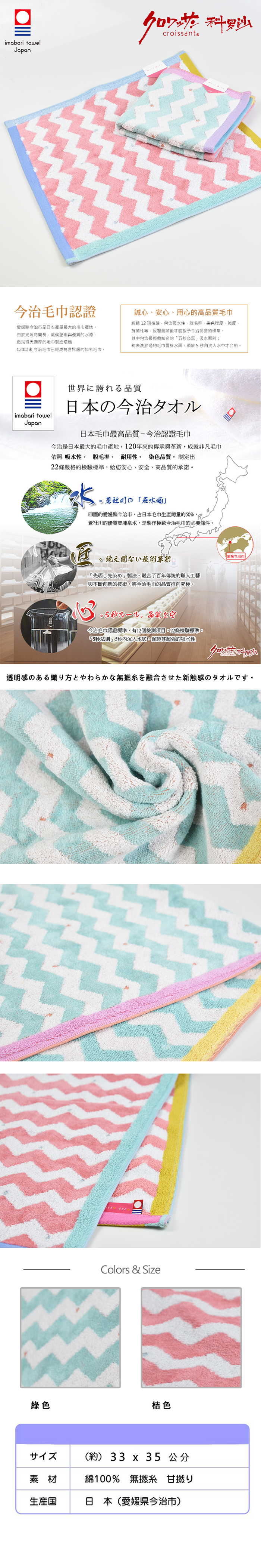 ●日本今治認證:通過嚴格測試,代表吸水性與安全性的最高標準。 ●100%日本製造:安心品質,細緻工藝看得見。 ●無撚紗柔觸感:使用無撚紗織造,蓬鬆柔軟,呵護肌膚。 ●可愛波浪圖樣搭配彩色包邊,整體風格兼具日系可愛與高質感。