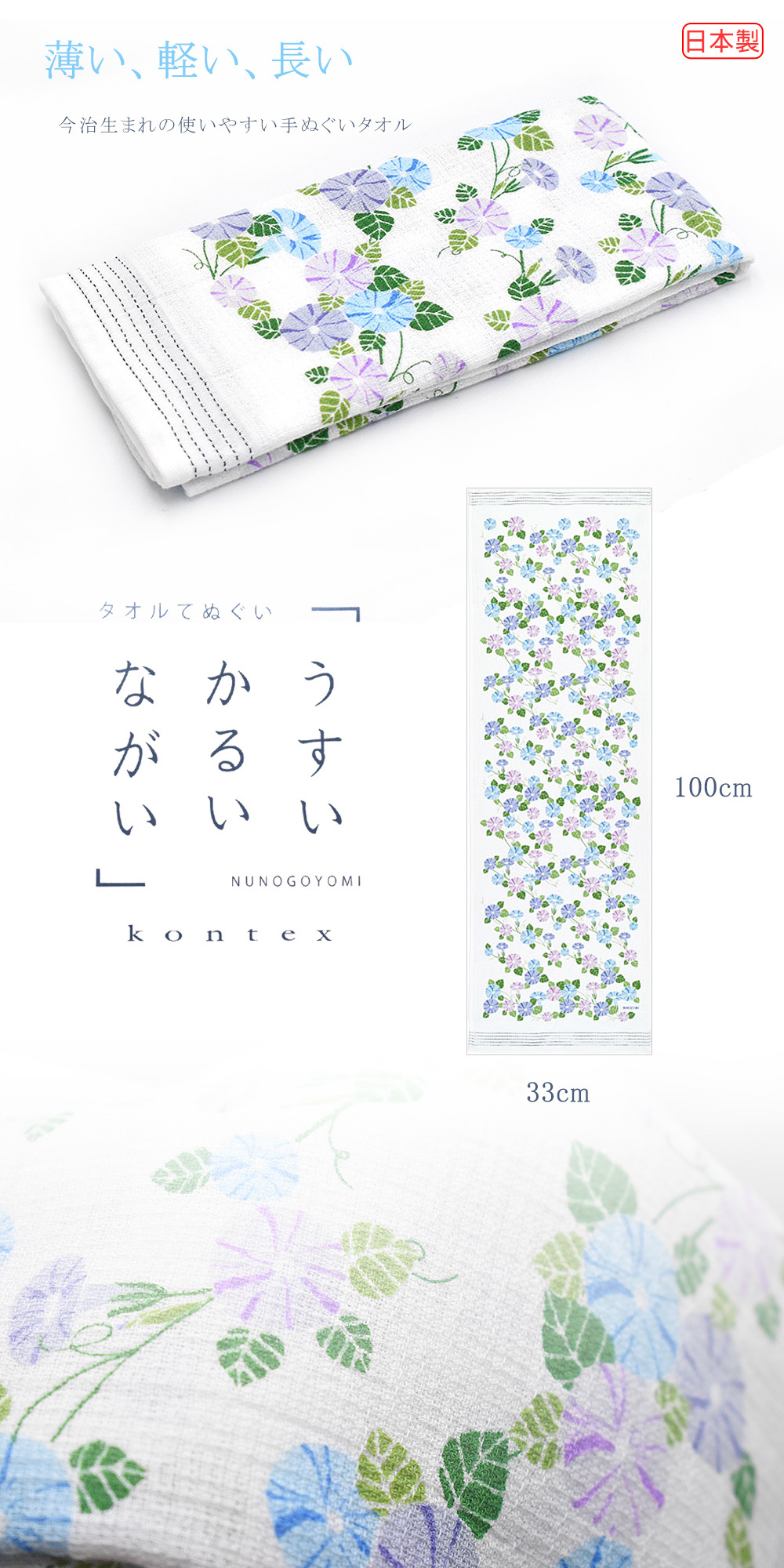 ●輕薄易乾易擰 攜帶方便 ●吸水性強 雙面織法 具摩擦感 ●長度加長 100公分可沐浴、運動等用途 ●質地柔軟 不易變硬越用越柔軟 ●日本今治生產質優耐用