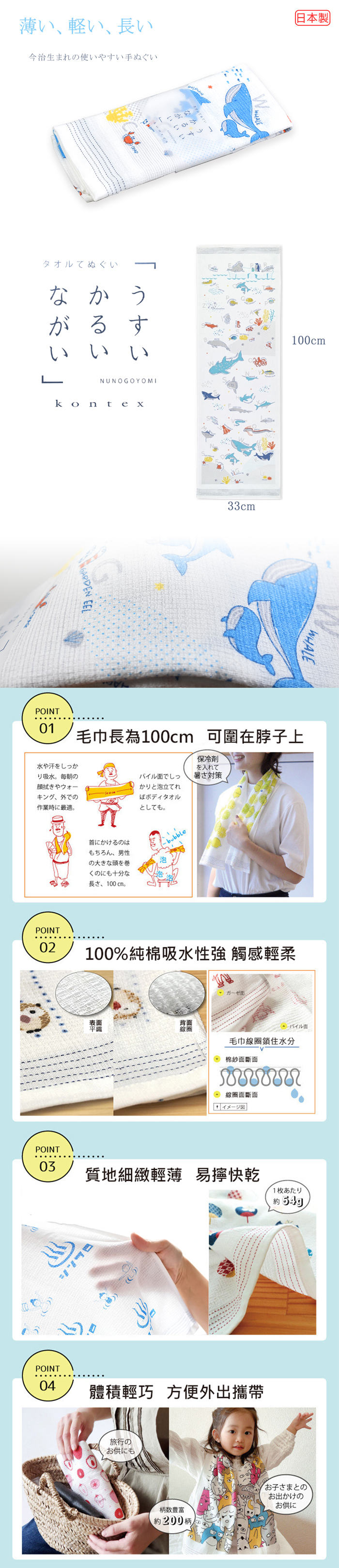 ●輕薄易乾 易擰攜帶方便 ●吸水性強 100%純棉製作 ●長度加長 100公分功能性更豐富 ●質地柔軟 不易變硬越用越柔軟 ●日本今治生產品質保證