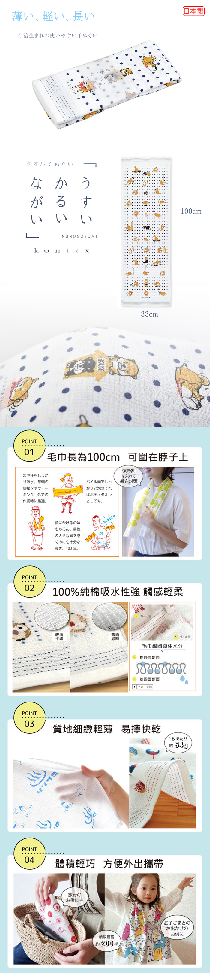 ●輕薄易乾 易擰攜帶方便 ●吸水性強 100%純棉製作 ●長度加長 100公分功能性更豐富 ●質地柔軟 不易變硬越用越柔軟 ●日本今治生產品質保證
