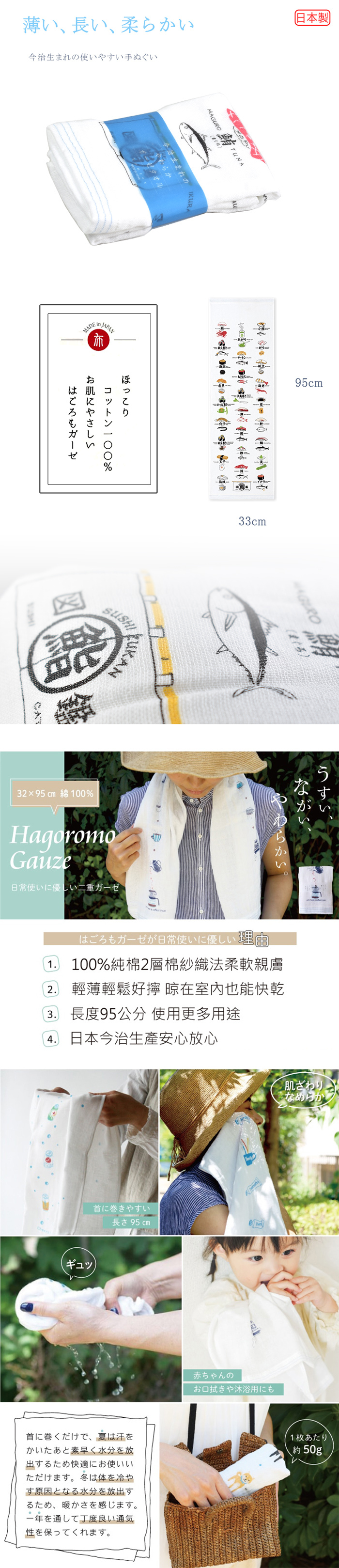 ●輕薄易乾易擰 攜帶方便 ●吸水性強 2層棉紗織法 柔軟親膚 ●長度加長 38公分可沐浴、運動等用途 ●質地柔軟 100%純棉 老人小孩都適合 ●日本今治生產質優耐用