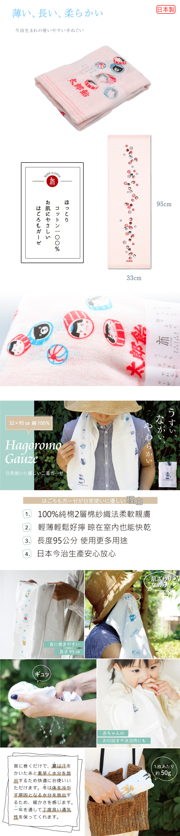 ●輕薄易乾易擰 攜帶方便 ●吸水性強 2層棉紗織法 柔軟親膚 ●長度加長 95公分可沐浴、運動等用途 ●質地柔軟 100%純棉 老人小孩都適合 ●日本今治生產質優耐用