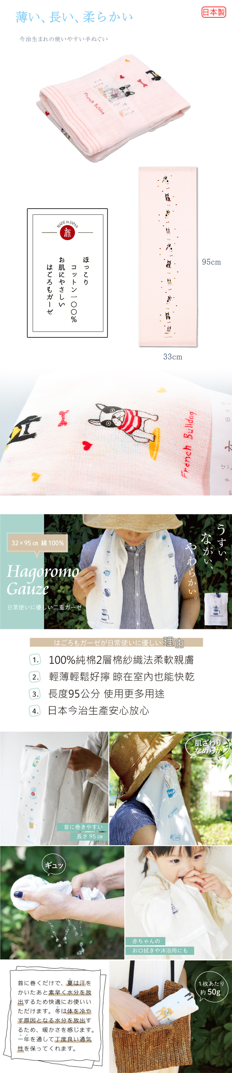 ●輕薄易乾易擰 攜帶方便 ●吸水性強 2層棉紗織法 柔軟親膚 ●長度加長 95公分可沐浴、運動等用途 ●質地柔軟 100%純棉 老人小孩都適合 ●日本今治生產質優耐用