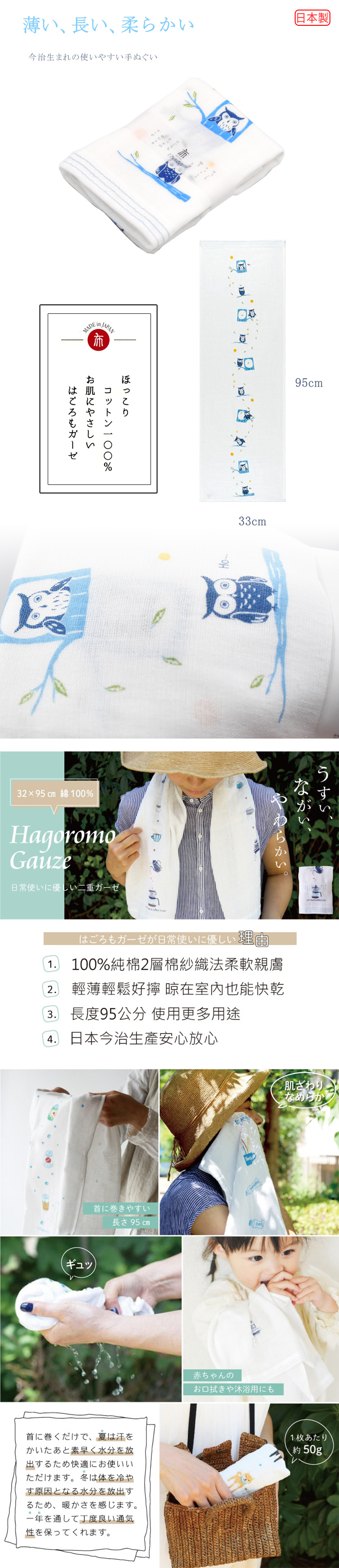 ●輕薄易乾易擰 攜帶方便 ●吸水性強 2層棉紗織法 柔軟親膚 ●長度加長 95公分可沐浴、運動等用途 ●質地柔軟 100%純棉 老人小孩都適合 ●日本今治生產質優耐用