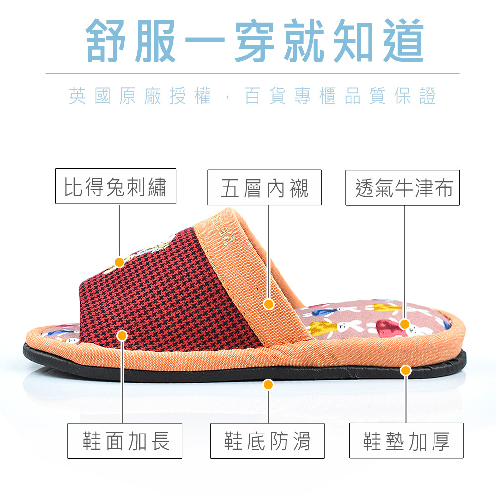 比得兔可愛刺繡,圖案不易脫落,透氣牛津布包覆,柔軟又舒適耐磨,鞋底增厚紓壓,並縫有防滑條,讓您不管在家還是在公司都能放鬆辛苦的雙腳