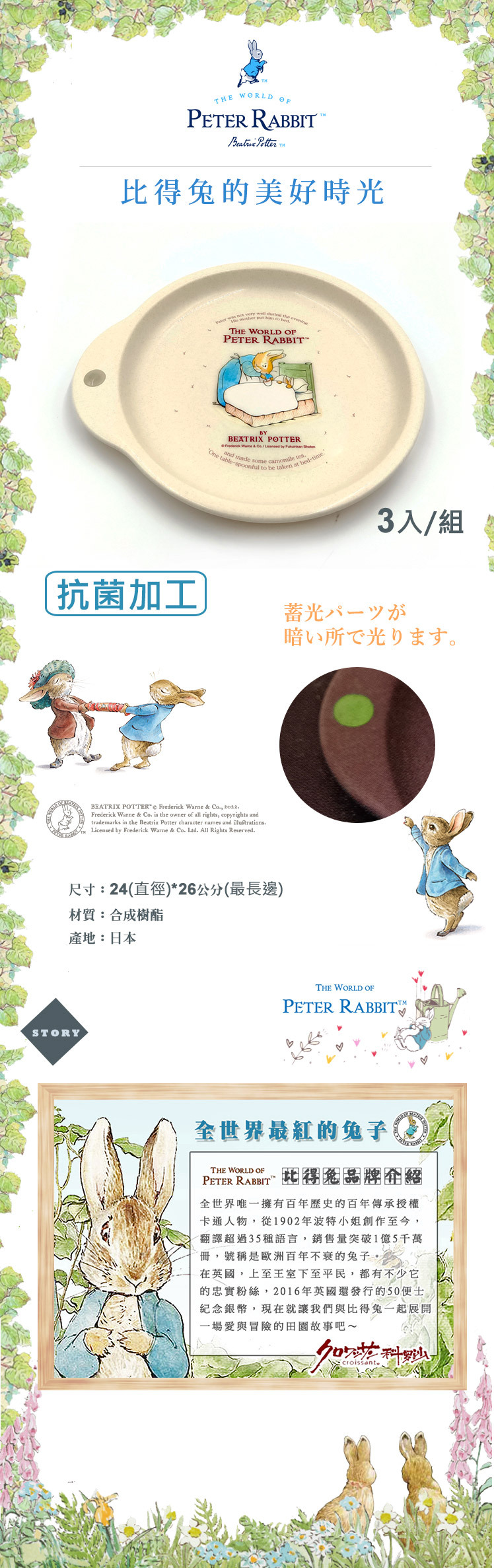 ●正版比得兔授權 ●蓄光設計 暗處也方便拿取 ●適合裝水果 餅乾小點心 ●重量輕不易摔破小朋友也能使用