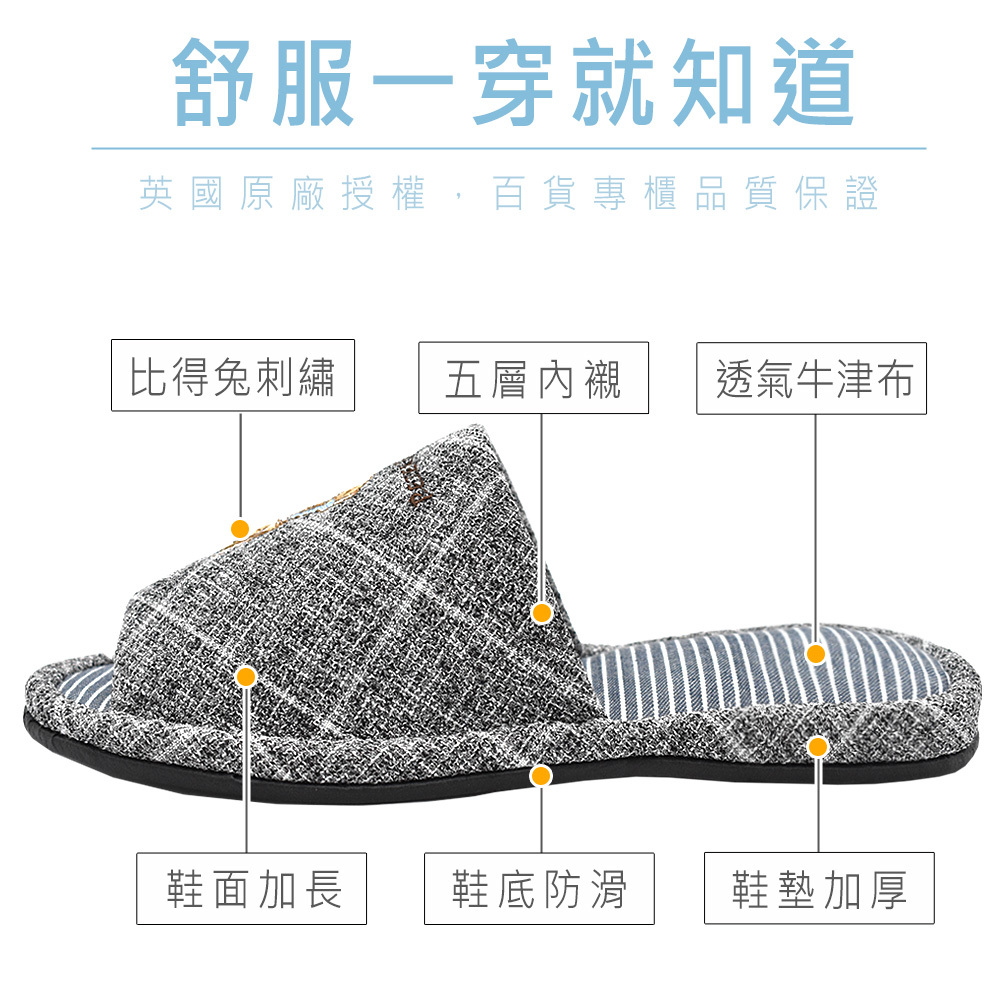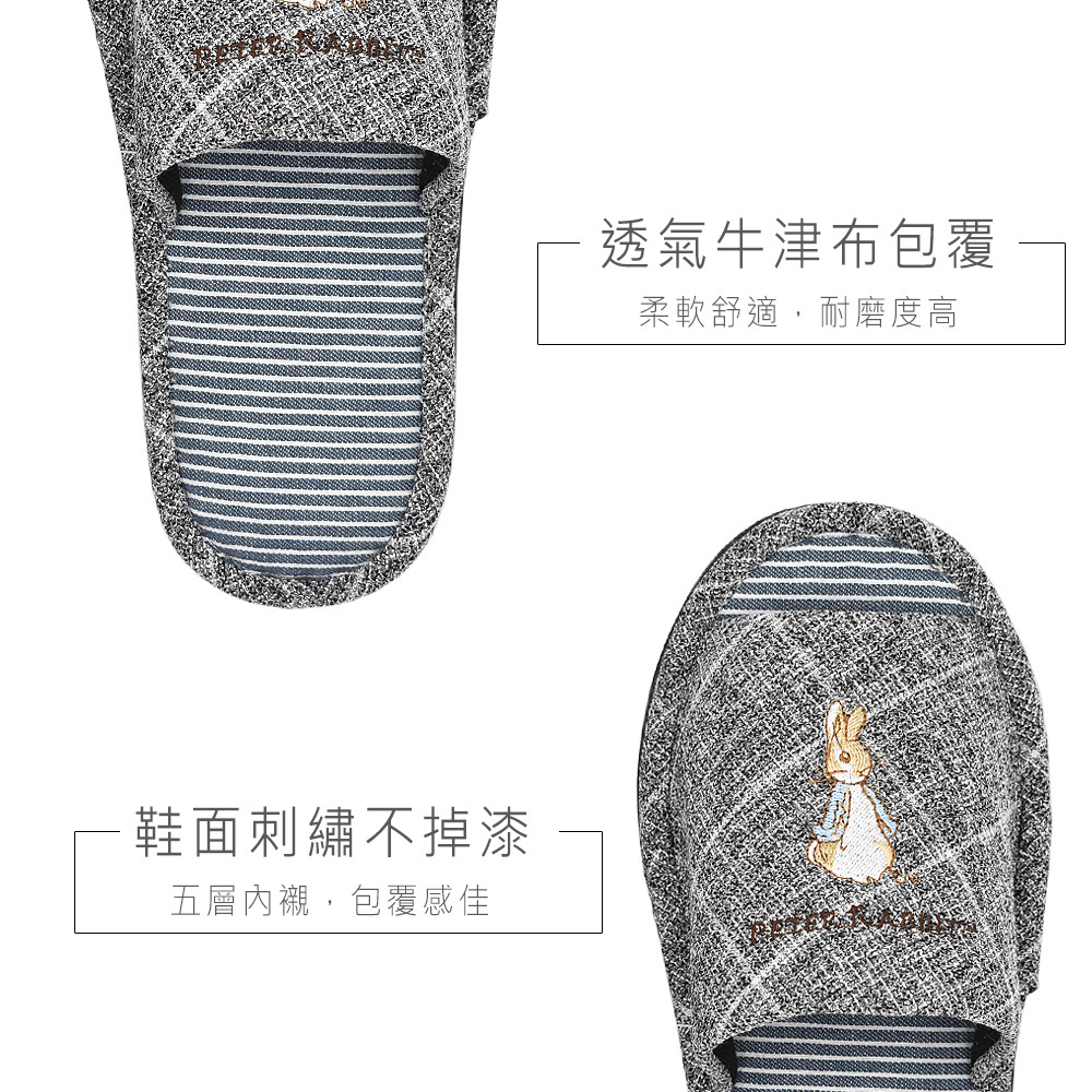 比得兔可愛刺繡,圖案不易脫落,透氣牛津布包覆,柔軟又舒適耐磨,鞋底增厚紓壓,並縫有防滑條,讓您不管在家還是在公司都能放鬆辛苦的雙腳