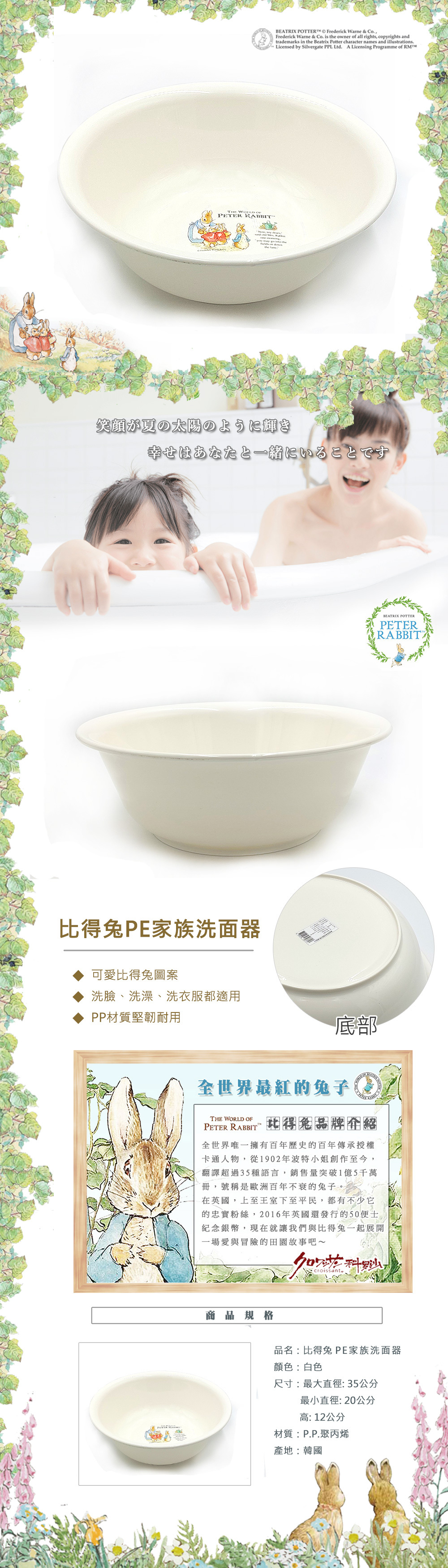 ●英國正版授權 ●比得兔可愛圖案 ●洗臉、洗澡、洗衣服都適用 ● PP材質堅韌耐用