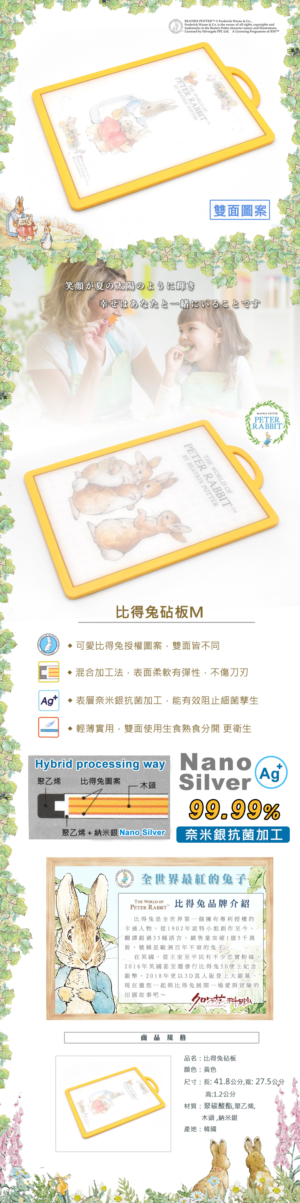 可愛比得兔授權圖案,雙面皆不同,表層混合加工法,讓表面柔軟有彈性不傷刀刃,表層奈米銀抗菌處理,能有效阻止細菌孳生,輕薄實用,雙面使用生食熟食分開 更衛生