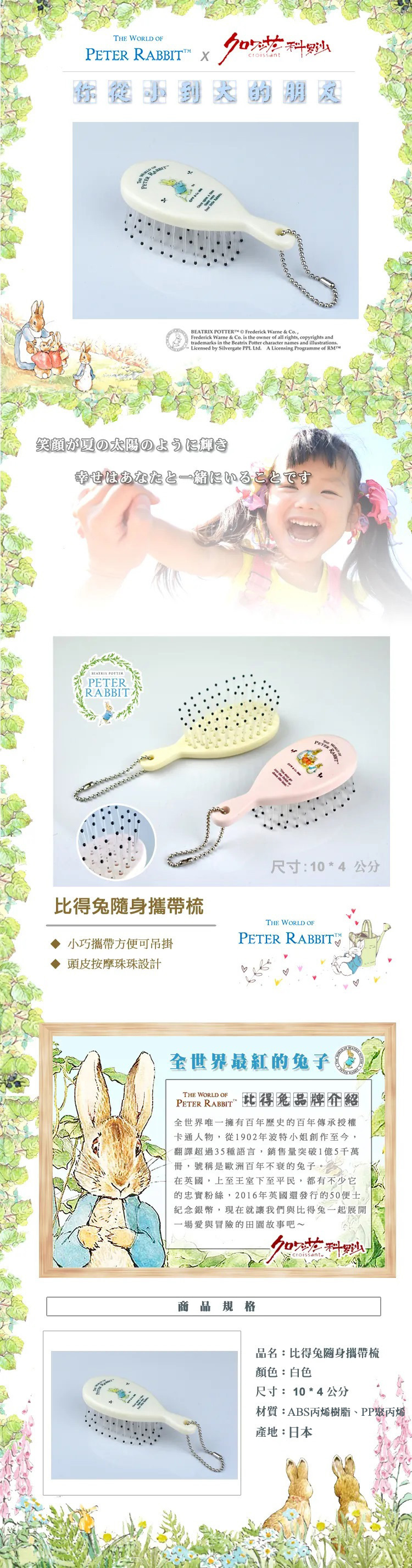 ●小巧好攜帶 ●前端頭皮按摩顆粒 ●日本製造,用的安心 ●經典比得兔圖案