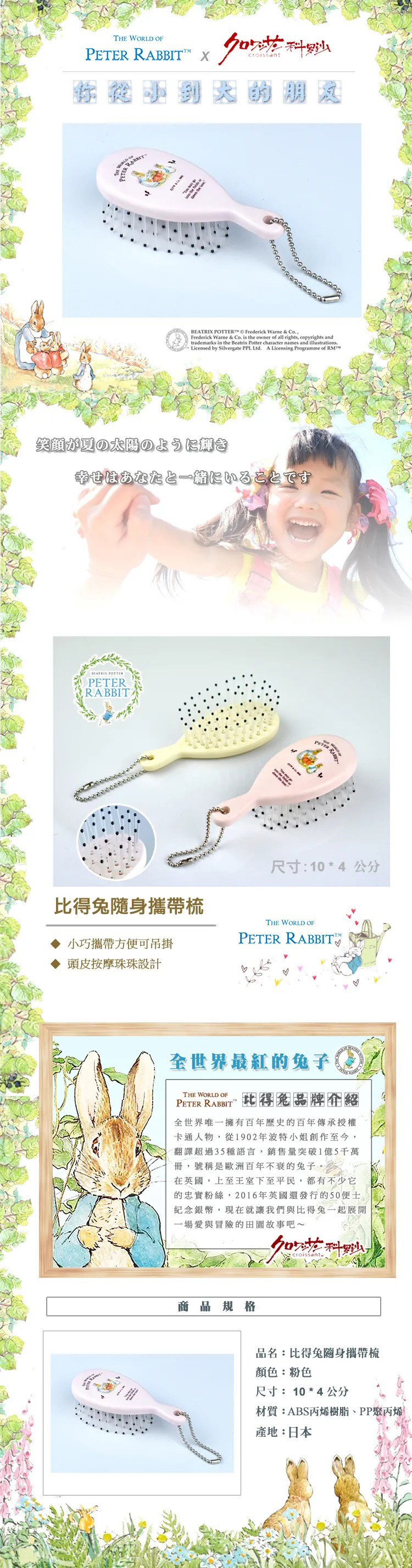 ●小巧好攜帶 ●前端頭皮按摩顆粒 ●日本製造,用的安心 ●經典比得兔圖案