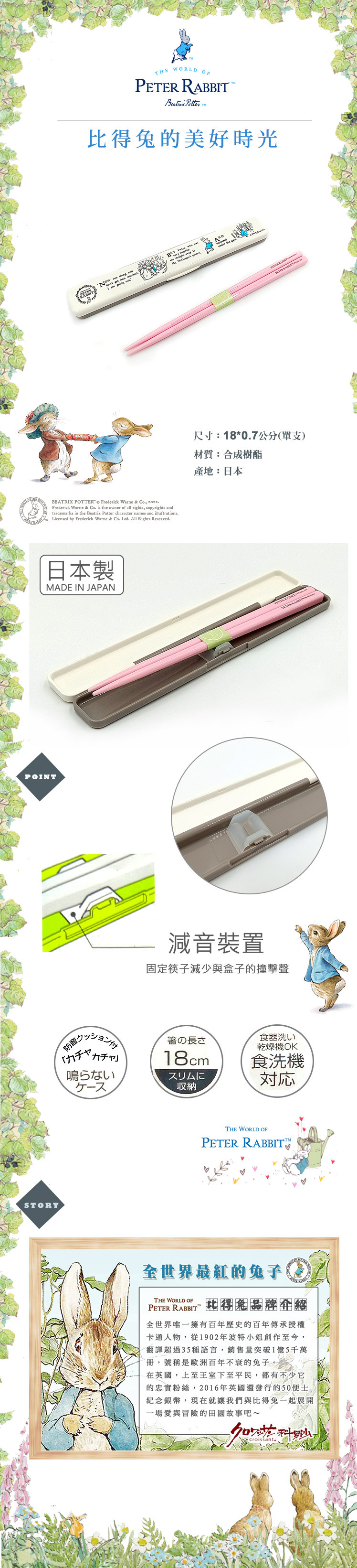 ●正版比得兔授權 ●輕巧好攜帶 ●筷子固定設計減少碰撞聲音 ●日本製造