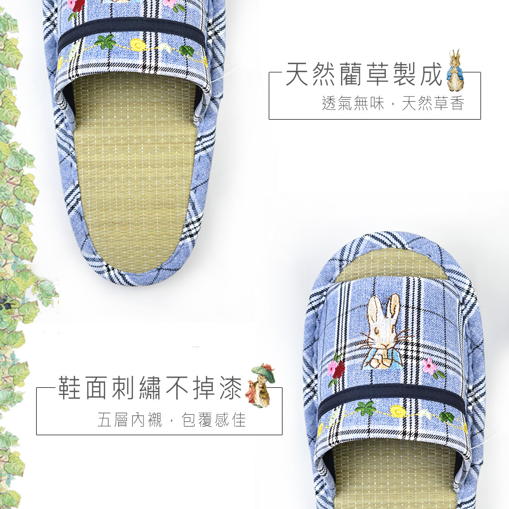 ●英國正版授權,防偽雷射貼紙 ●比得兔可愛刺繡,圖案不易脫落 ●天然藺草編織,草香無塑膠味 ●鞋底增厚紓壓,放鬆辛苦的雙腳