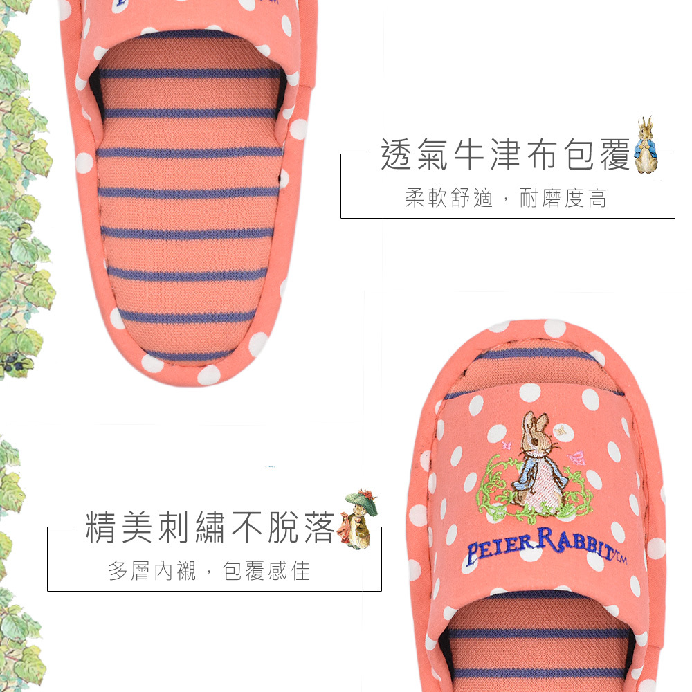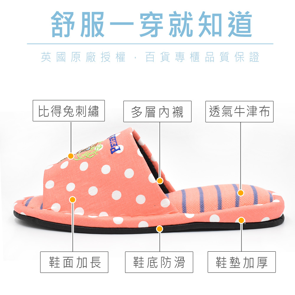 比得兔可愛刺繡,圖案不易脫落,透氣牛津布包覆,觸感柔軟舒適,鞋底增厚紓壓,並縫有防滑條,讓您不管在家還是在公司都能放鬆辛苦的雙腳