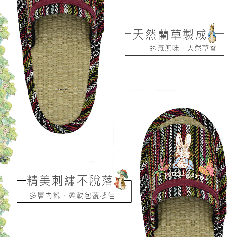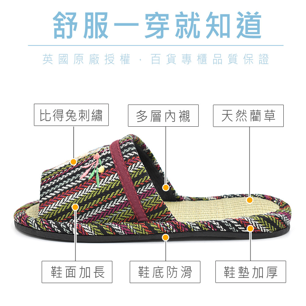 ●英國正版授權,防偽雷射貼紙 ●比得兔可愛刺繡,圖案不易脫落 ●天然藺草編織,草香無塑膠味 ●鞋底增厚紓壓,放鬆辛苦的雙腳