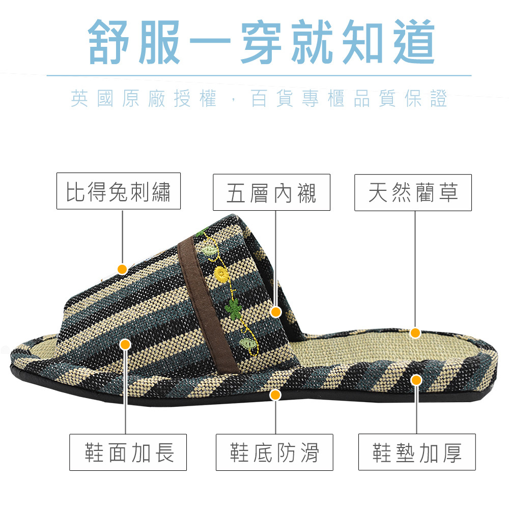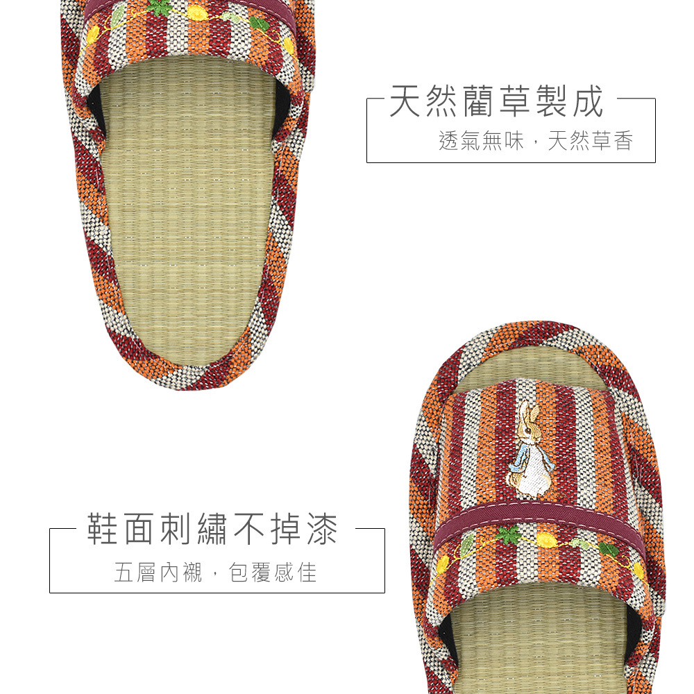 ●英國正版授權,防偽雷射貼紙 ●比得兔可愛刺繡,圖案不易脫落 ●天然藺草編織,草香無塑膠味 ●鞋底增厚紓壓,放鬆辛苦的雙腳