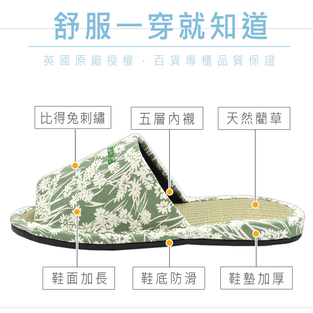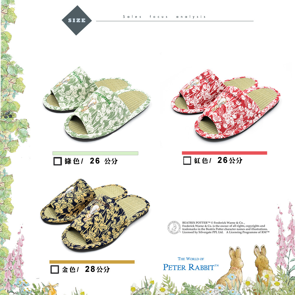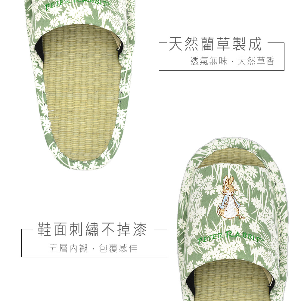 英國正版授權,防偽雷射貼紙,拖鞋鞋面比得兔可愛刺繡,圖案不易脫落,草蓆由天然藺草編織,草香無塑膠味,鞋底增厚紓壓,並縫有防滑條,讓您不管在家還是在公司都能放鬆辛苦的雙腳