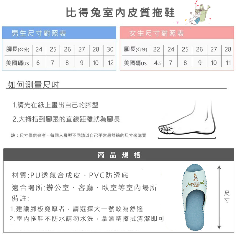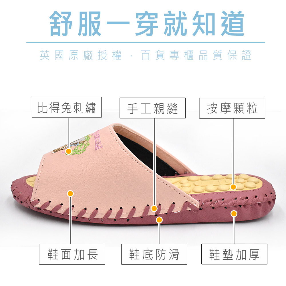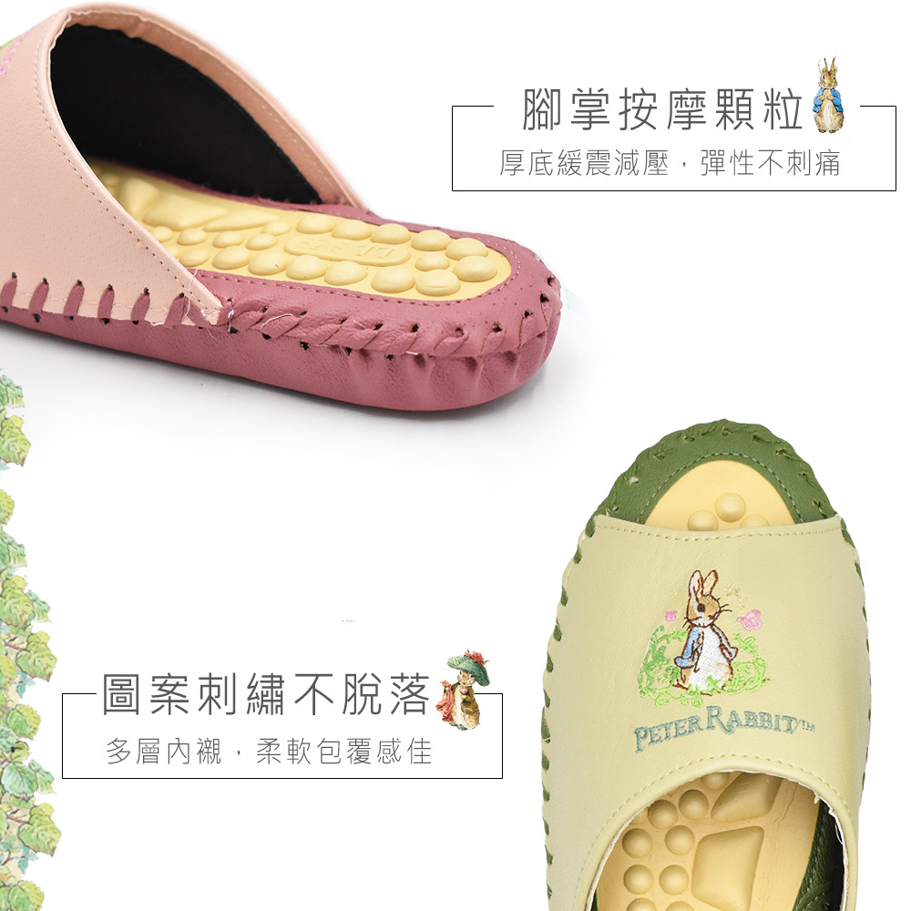 比得兔可愛刺繡,圖案不易脫落,老師傅手工親縫,舒適包覆感佳,彈性按摩顆粒,好走不刺痛