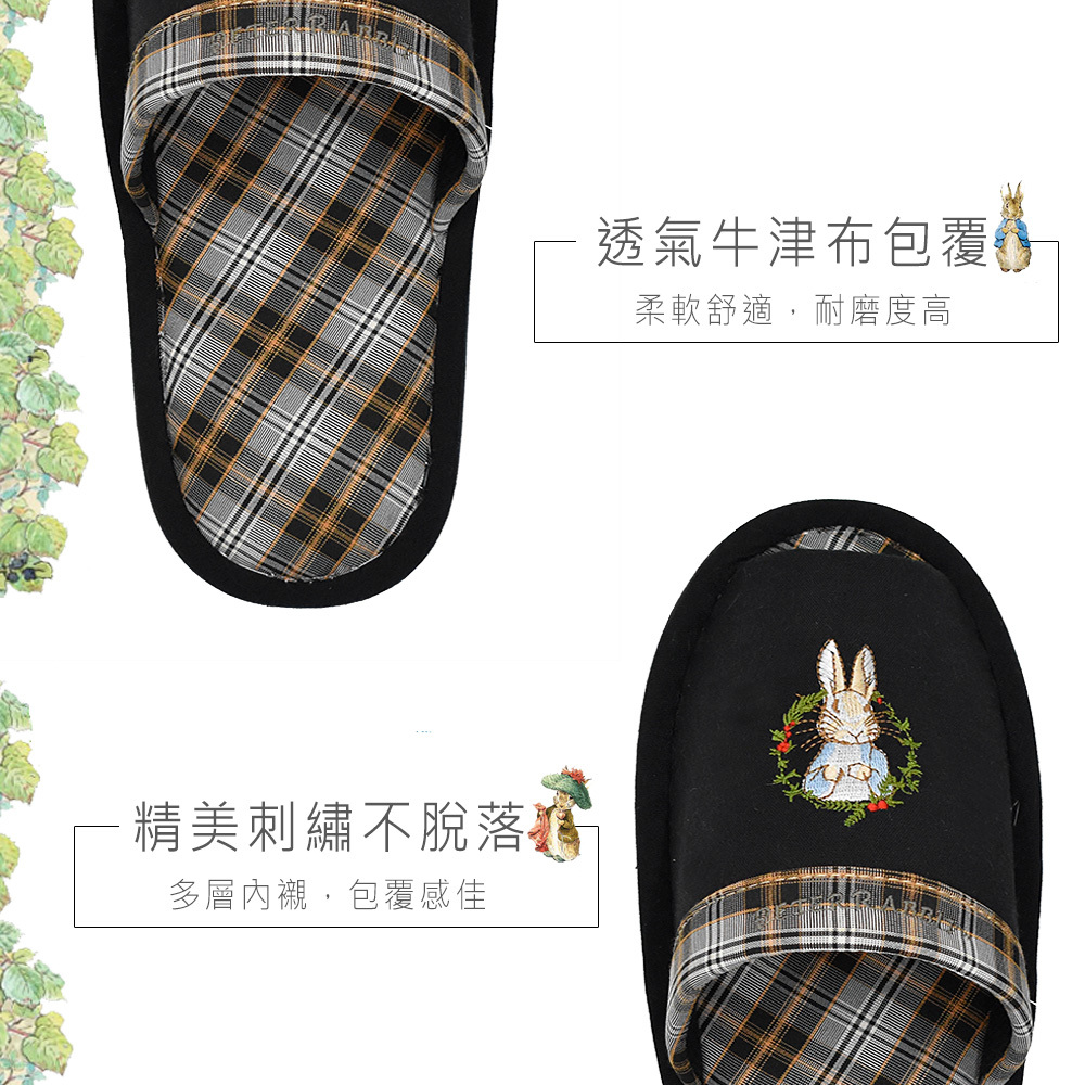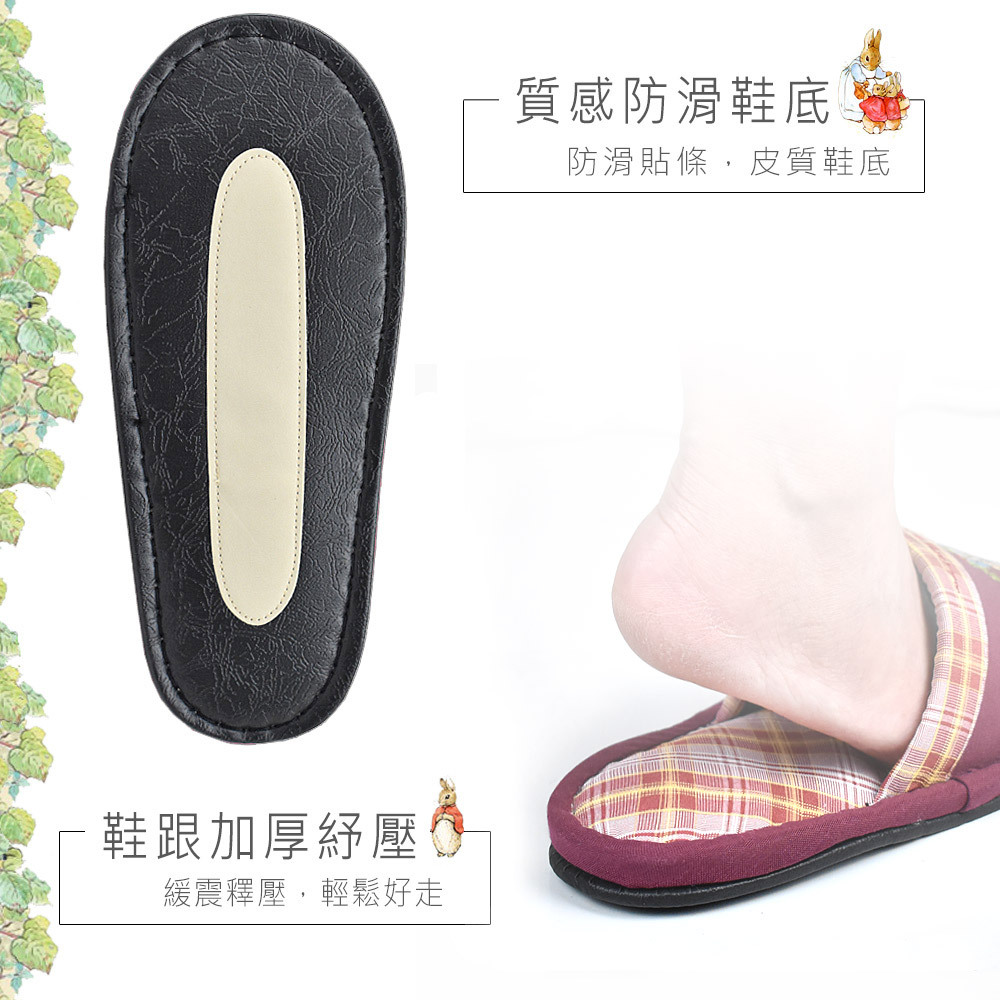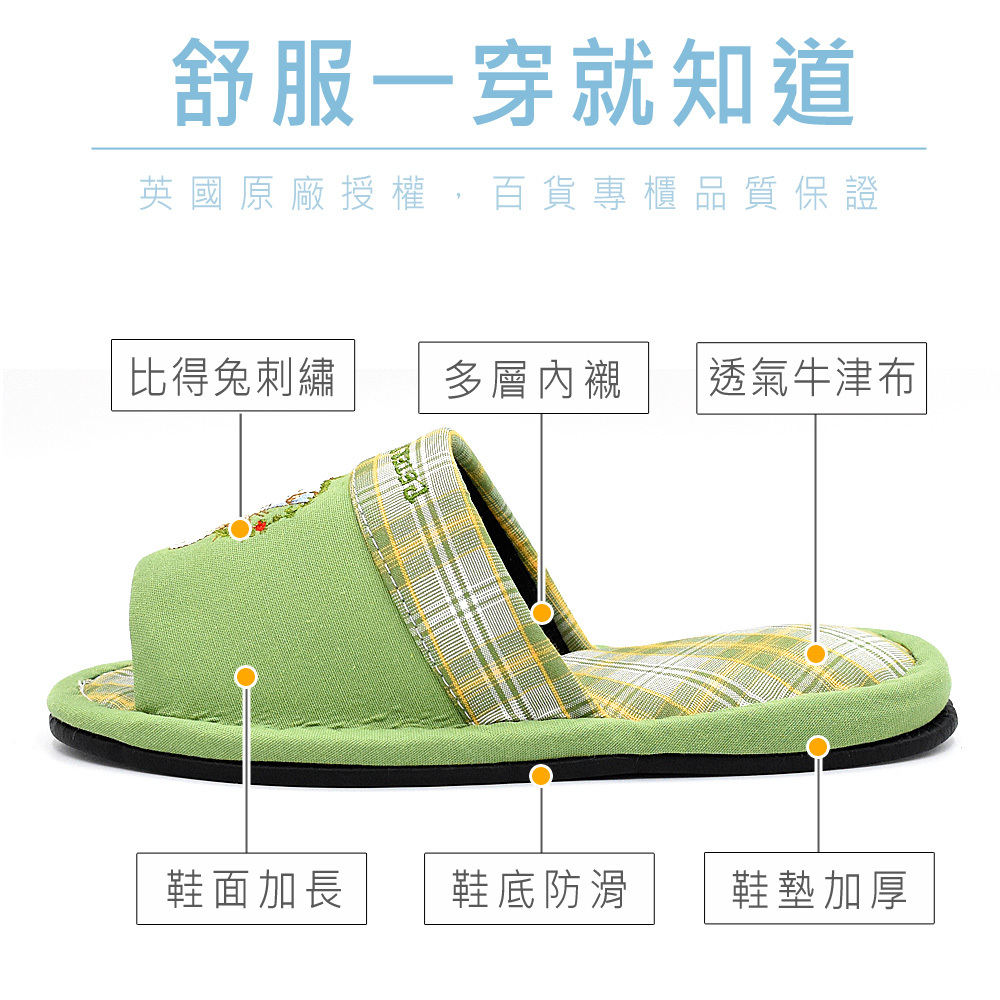 比得兔可愛刺繡,圖案不易脫落,透氣牛津布包覆,觸感柔軟舒適,鞋底增厚紓壓,並縫有防滑條,讓您不管在家還是在公司都能放鬆辛苦的雙腳