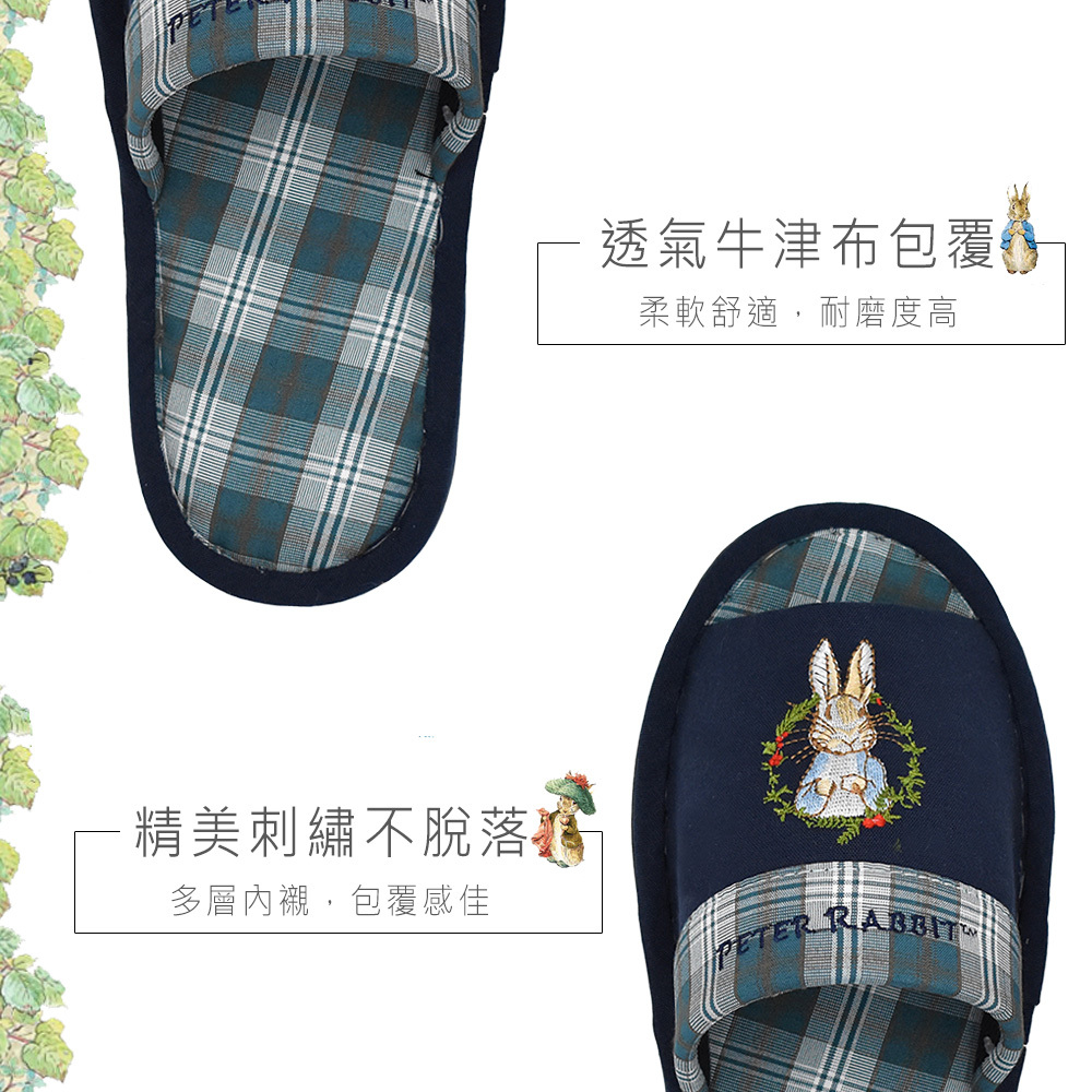 比得兔可愛刺繡,圖案不易脫落,透氣牛津布包覆,觸感柔軟舒適,鞋底增厚紓壓,並縫有防滑條,讓您不管在家還是在公司都能放鬆辛苦的雙腳