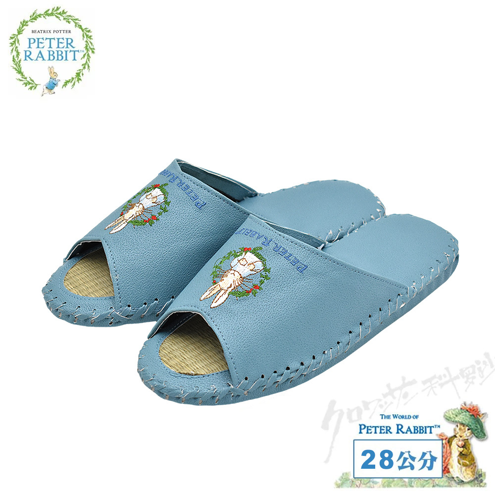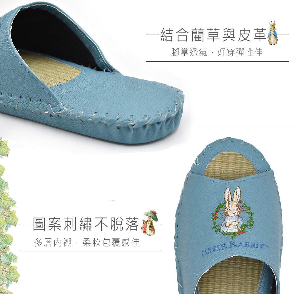 英國正版授權,防偽雷射貼紙,拖鞋鞋面比得兔可愛刺繡,圖案不易脫落,草蓆由天然藺草編織,草香無塑膠味,與皮革結合質感更細緻,鞋底增厚紓壓,並縫有防滑條,讓您不管在家還是在公司都能放鬆辛苦的雙腳