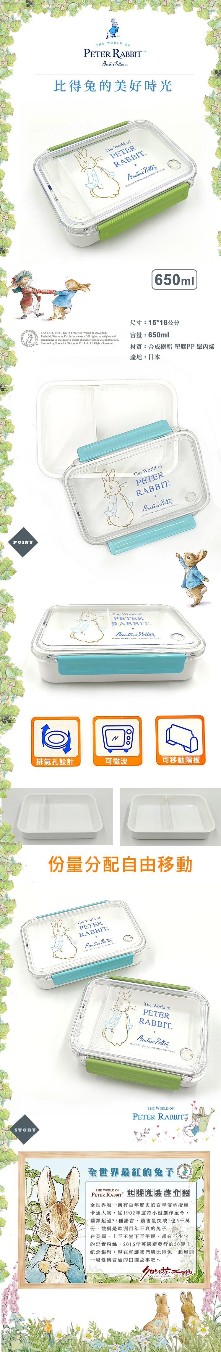 ●正版比得兔授權 ●可微波 透氣孔設計 ●比得兔透明上蓋 ●附移動式隔板 豐富創意