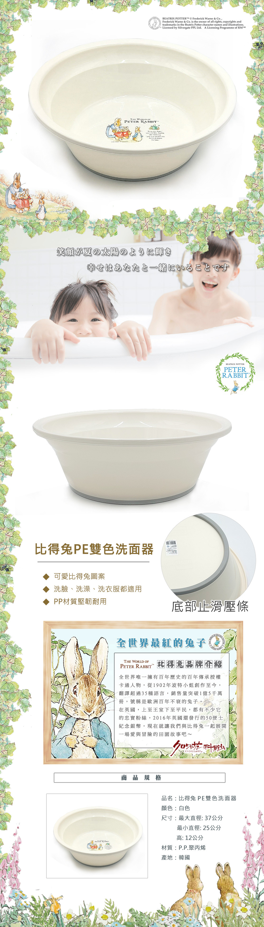 ●英國正版授權 ●比得兔可愛圖案 ●洗臉、洗澡、洗衣服都適用 ● PP材質堅韌耐用 ●底部止滑壓條