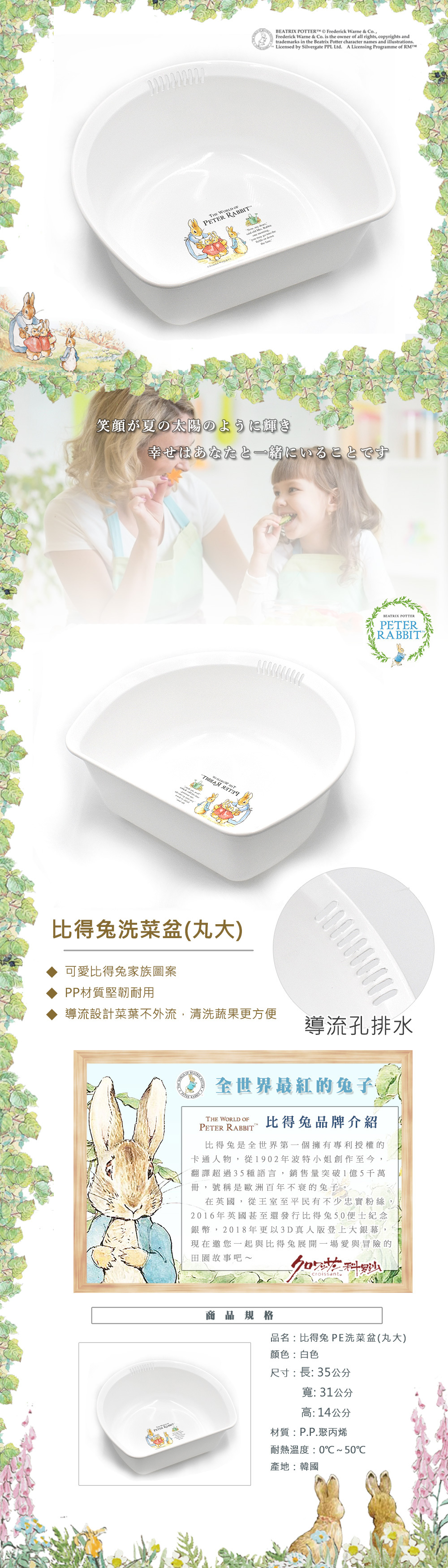 ●英國正版授權 ●比得兔可愛圖案 ●導流設計清洗蔬果更方便 ● PP材質堅韌耐用