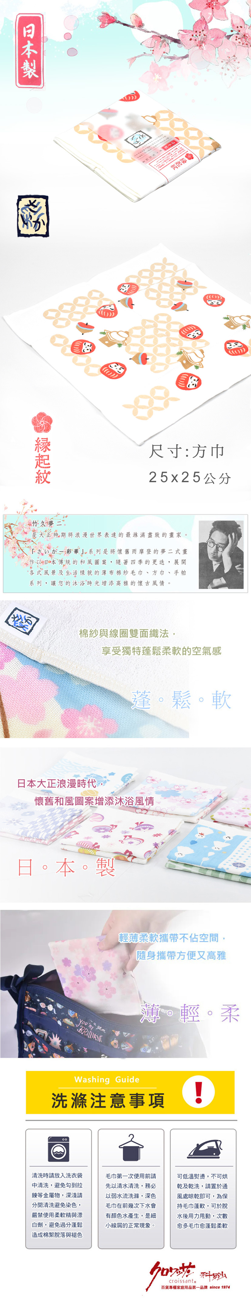 ●日本緣起紋象徵吉祥、光明、充滿祝福之意 ●毛巾工法採用一面棉紗一面普通線圈 ●兼具棉紗的柔軟與毛巾磨擦感,觸感柔順具吸水性。 ●方巾可做為手帕,攜帶方便。