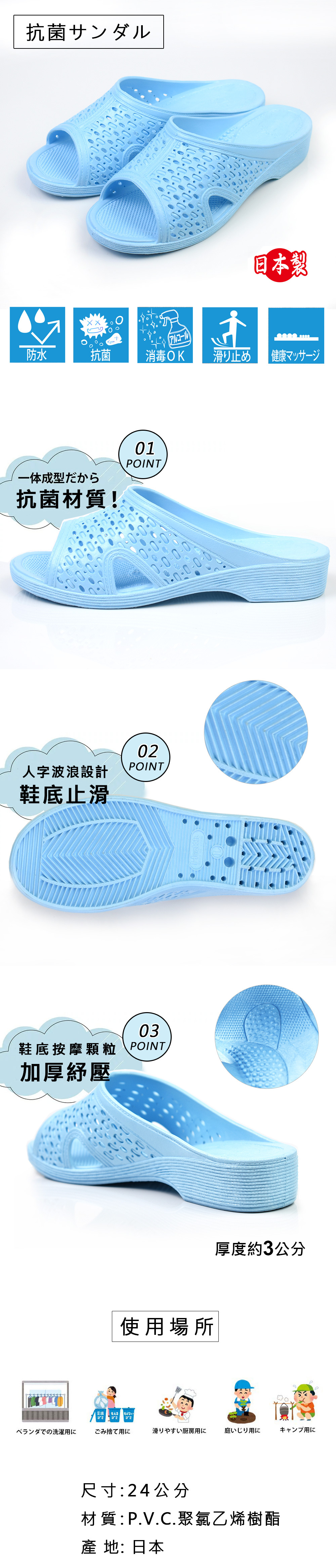 ●鞋底刻紋具止滑效果。 ●可酒精消毒不掉色 ●中底前段細顆粒及足弓凸弧造型,符合人體工學。 ●素材中含抗菌成分, 衛生安全。 ●適用沐浴、清掃、陽台、廚房、園藝。