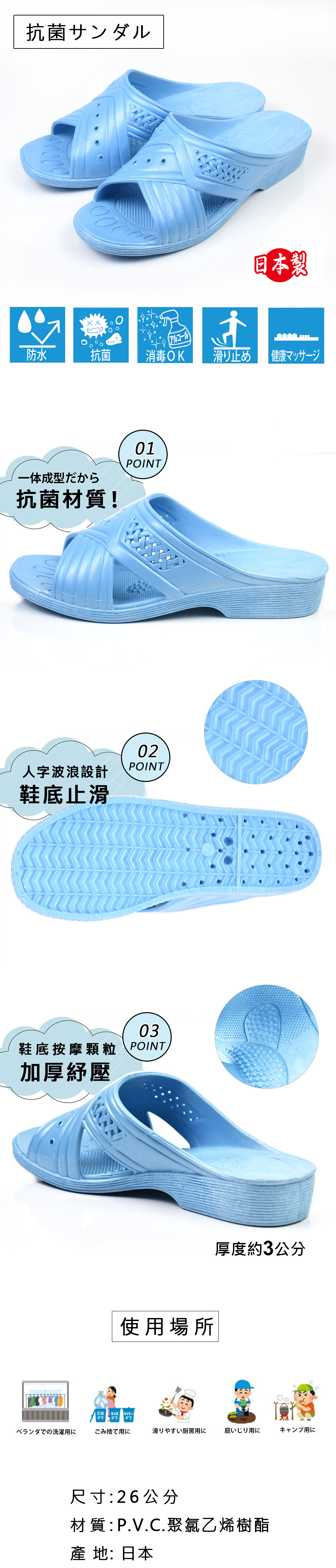鞋底刻紋具止滑效果。中底前段細顆粒及足弓凸弧造型,,符合人體工學。素材中含抗菌成分, 衛生安全。適用沐浴、清掃、陽台、廚房、園藝。