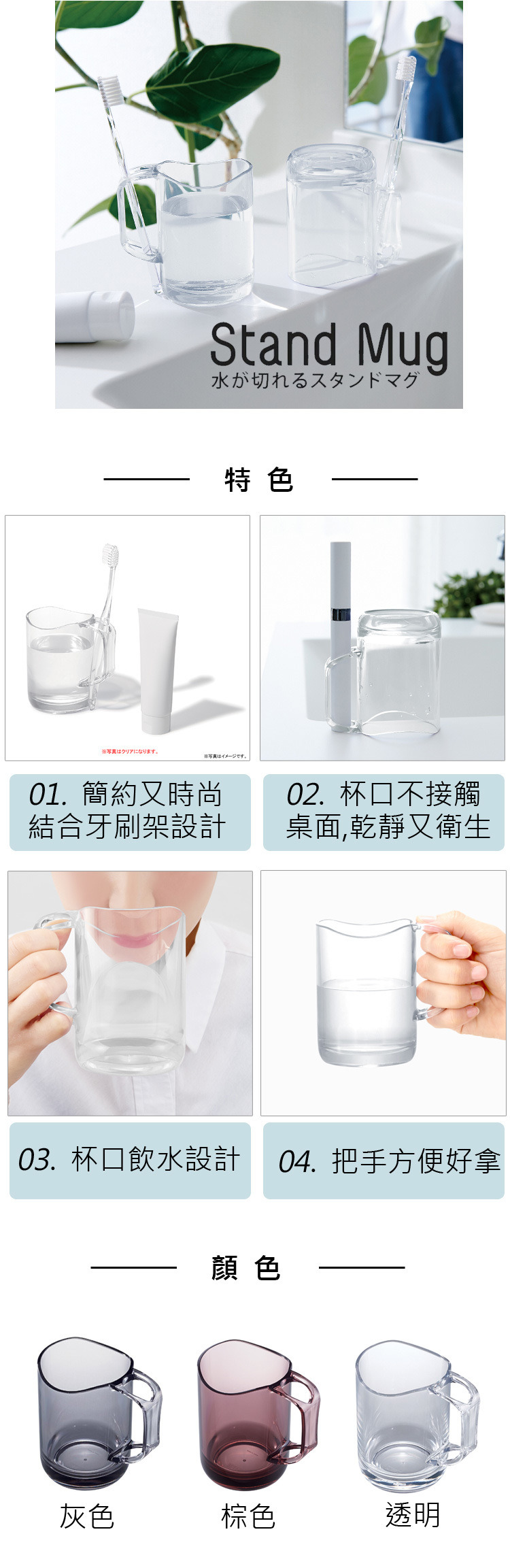 杯口弧度設計,朝下放置不接觸桌面,乾淨衛生 把手有洞孔,牙刷可插入放置 把手設計,洗漱時方便好拿