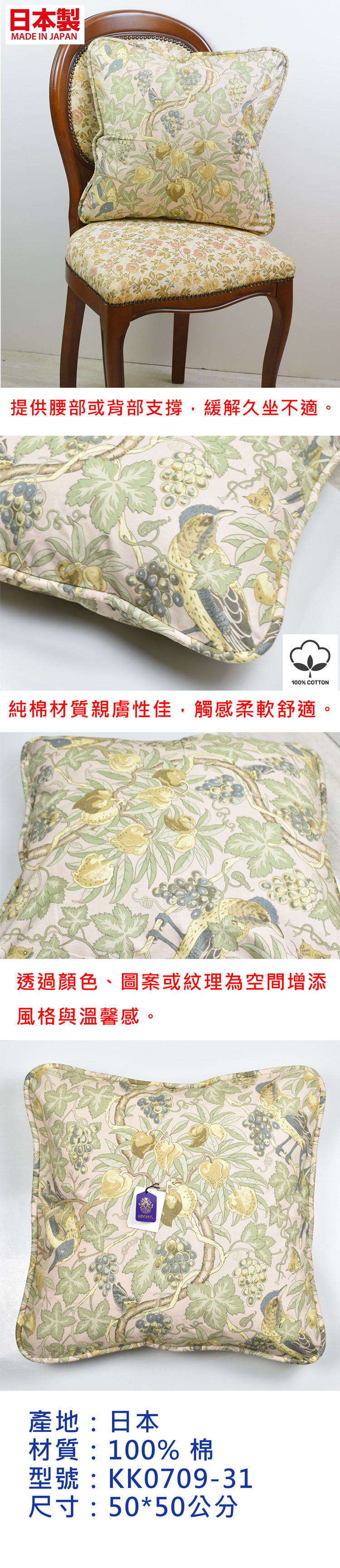 ●日本製造品質保證 ●面料100%純棉 ●圖案精緻典雅 ●附贈棉芯