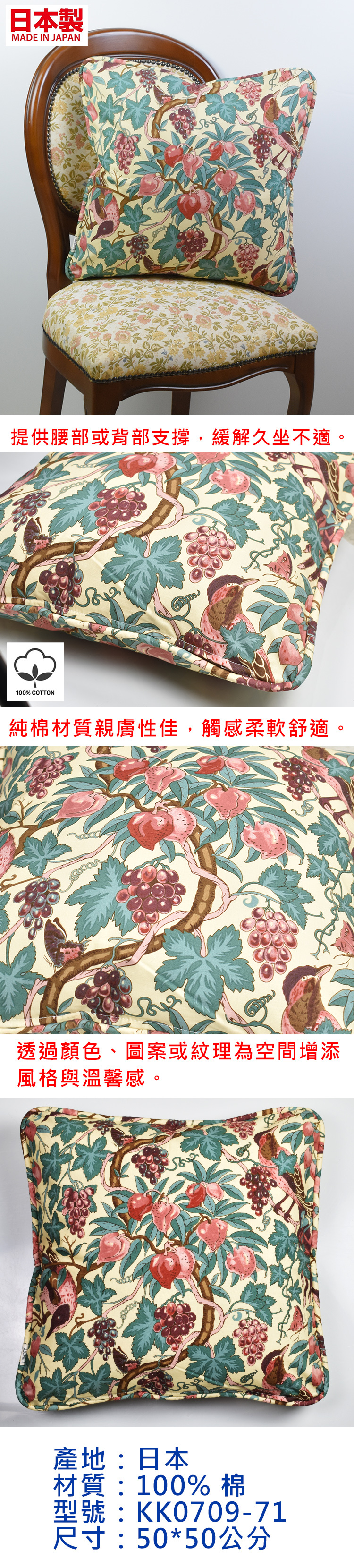 ●日本製造品質保證 ●面料100%純棉 ●圖案精緻典雅 ●附贈棉芯