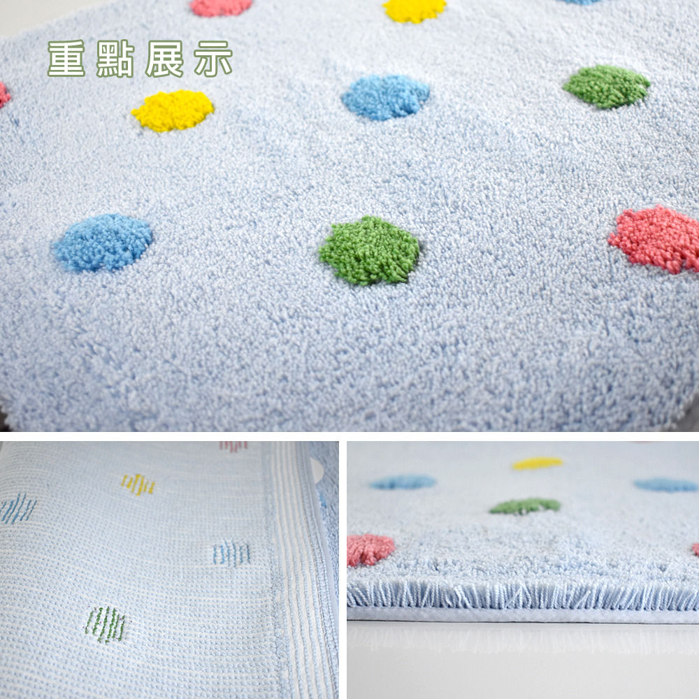 ●優質壓克力棉,吸水性佳 ●底部止滑加工,安全不滑動 ●採用多色線,做出彩色點綴,優雅可愛 ●適用於浴室門口、玄關、陽台門、床邊等
