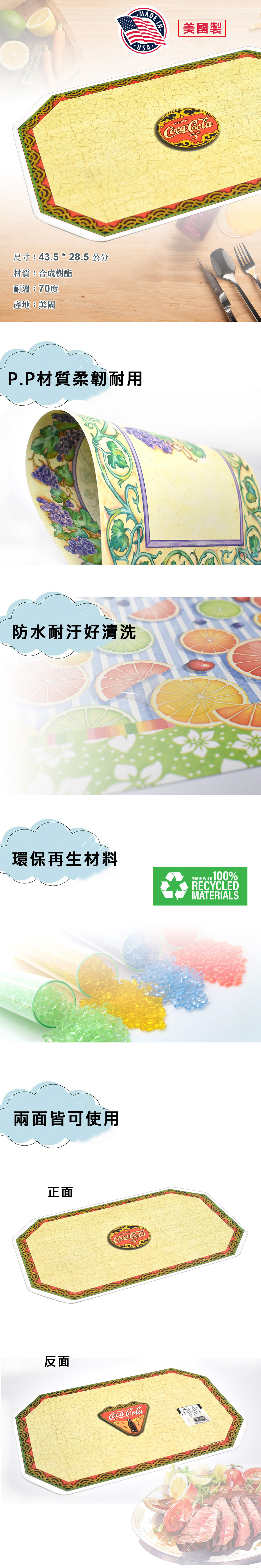 P.P材質柔韌耐用,防水耐汙好清洗,兩面不同圖案皆可使用,使用環保再生材料,友善環境愛地球,美國製造品質保證