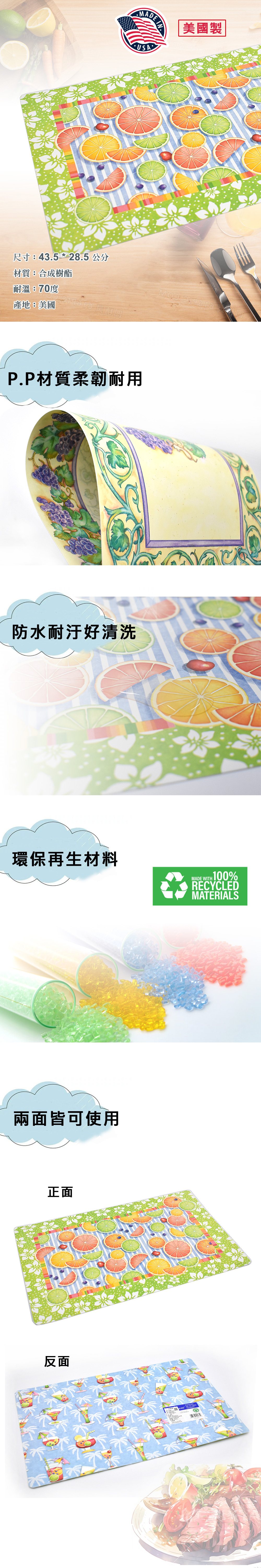 ●P.P材質柔韌耐用 ●防水耐汙好清洗 ●兩面不同圖案皆可使用 ●使用環保再生材料 ●美國製造