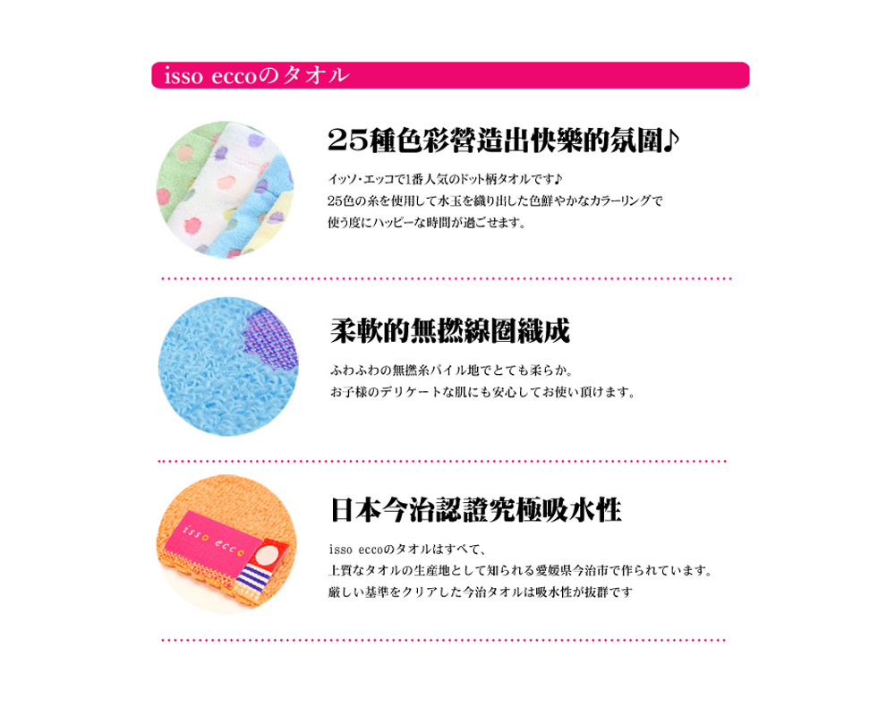 特點 : 以5種顏色相互交錯,織成有25色彩色圓點的設計,是isso ecco的招牌圖騰。